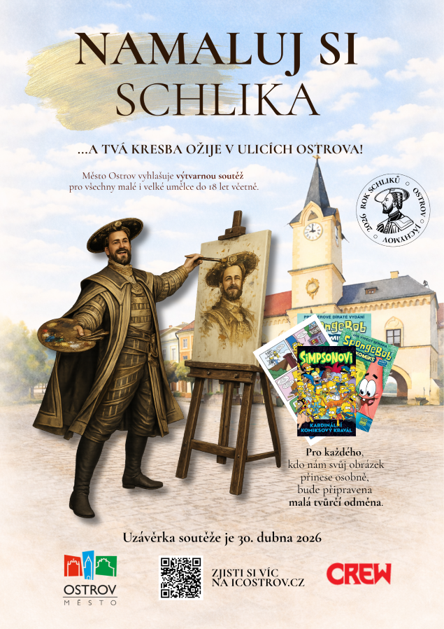 Město Ostrov slaví Rok Schliků 2026 a vy se můžete stát spolutvůrcem oslav. Namalujte Schlika v Ostrově – jakéhokoliv a kdekoliv se vám bude líbit. Jakýmkoliv stylem, na výšku nebo na šířku. Ta nejlepší ztvárnění uvedeme do života. Jak? Potkáte je na ulici, na lavičkách nebo v altánku. A kromě sladké odměny pro vítěze tak budete mít radost i ze svého obrázku, který bude na očích všech návštěvníků a obyvatel Ostrova minimálně po celé léto. Proto nezapomeň uvést své jméno, autorství odprezentujeme nejen při vyhlášení, ale i u realizovaných prací.