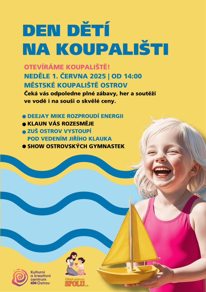 V neděli 1. června od 14:00 hod. se můžete těšit na energického Deejaye Mikea, veselého klauna, vystoupení žáků ZUŠ Ostrov pod vedením Jiřího Klauka i show šikovných ostrovských gymnastek. Zábava na suchu i ve vodě, skvělé ceny, hudba a radost z prvního letního dne. Během oslav Dne dětí na koupališti budou vyhlášení i výherci výtvarné soutěže Když mám radost.