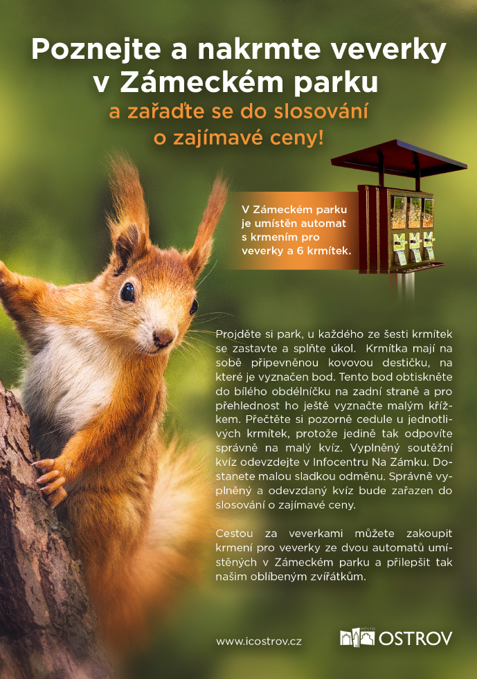Další, méně náročnou, co do vědomostí, přesto zábavnou a pátrací hrou, je soutěžní kvíz na téma Poznejte a nakrmte veverky v Zámeckém parku. Soutěžní kvíz si vyzvednete v Informačním centru Na Zámku. Právě tam dostanete instrukce a drobnou nápovědu, kde všude hledat 6 krmítek pro veverky. Na nich jsou připevněny kovové tabulky. Ty je nutno objevit a obtisknout výběžek na každé z nich na soutěžní kvíz. Součástí kvízu je i odpověď na 3 otázky. Kdo donese kvíz označen body ze všech šesti krmítek a zakroužkuje správné odpovědi, bude zařazen do každoměsíčního slosování.